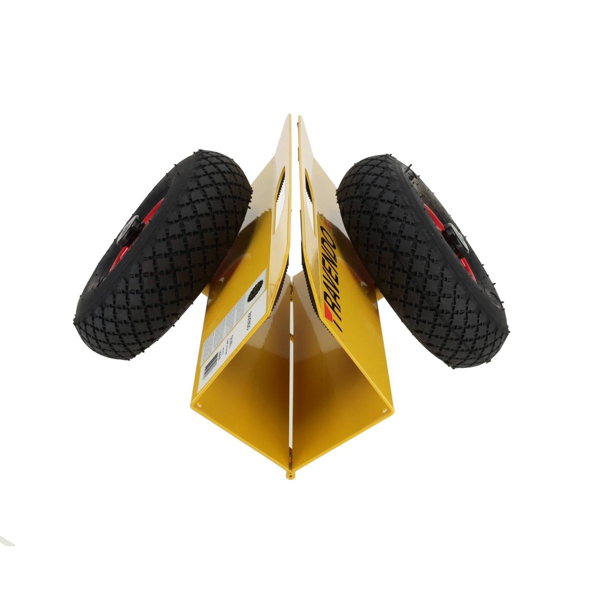 De gelaste staalconstructie met gele poedercoating biedt maximale stevigheid en bescherming tegen corrosie. De pneumatische luchtbanden (Ø 300 mm) met stalen velgen en rollagers zorgen voor een stabiel en soepel transport, zelfs op oneffen ondergronden zoals bouwplaatsen. Met een draagvermogen van 200 kg en een licht gewicht van slechts 8,5 kg is dit transportkarretje krachtig, handzaam en eenvoudig te verplaatsen.