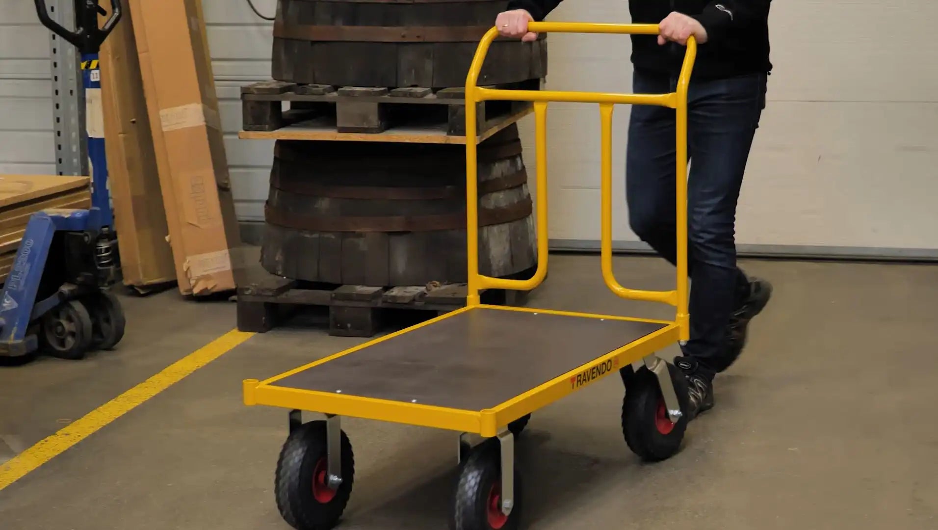 Het hoogwaardige stalen frame met gele poedercoating biedt bescherming tegen roest en slijtage. Deze platformwagen heeft een ruim laadvlak van 1000 x 600 mm en één stevig eindpaneel voor extra stabiliteit tijdens het transport.
