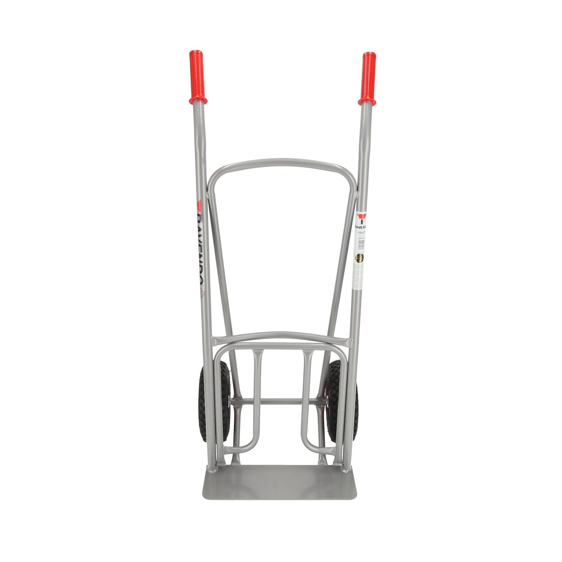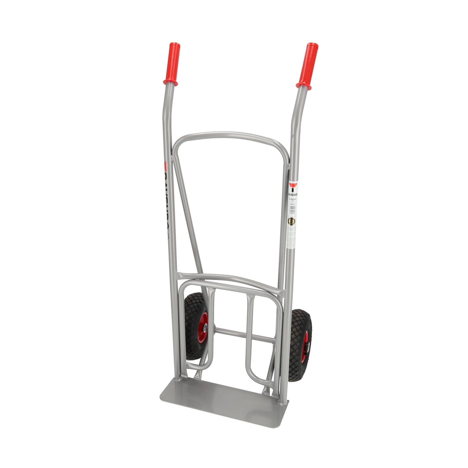 De pneumatische luchtbanden (Ø300 mm) op stalen velgen met rollagers zorgen voor een soepele en stabiele rit, ook op ongelijke ondergronden. De veiligheidshandgrepen van kunststof (25 mm) geven extra grip en beschermen de handen tijdens het manoeuvreren. Met een eigen gewicht van slechts 9,8 kg is deze steekwagen licht genoeg voor eenvoudig gebruik, maar toch sterk genoeg voor zware klussen.