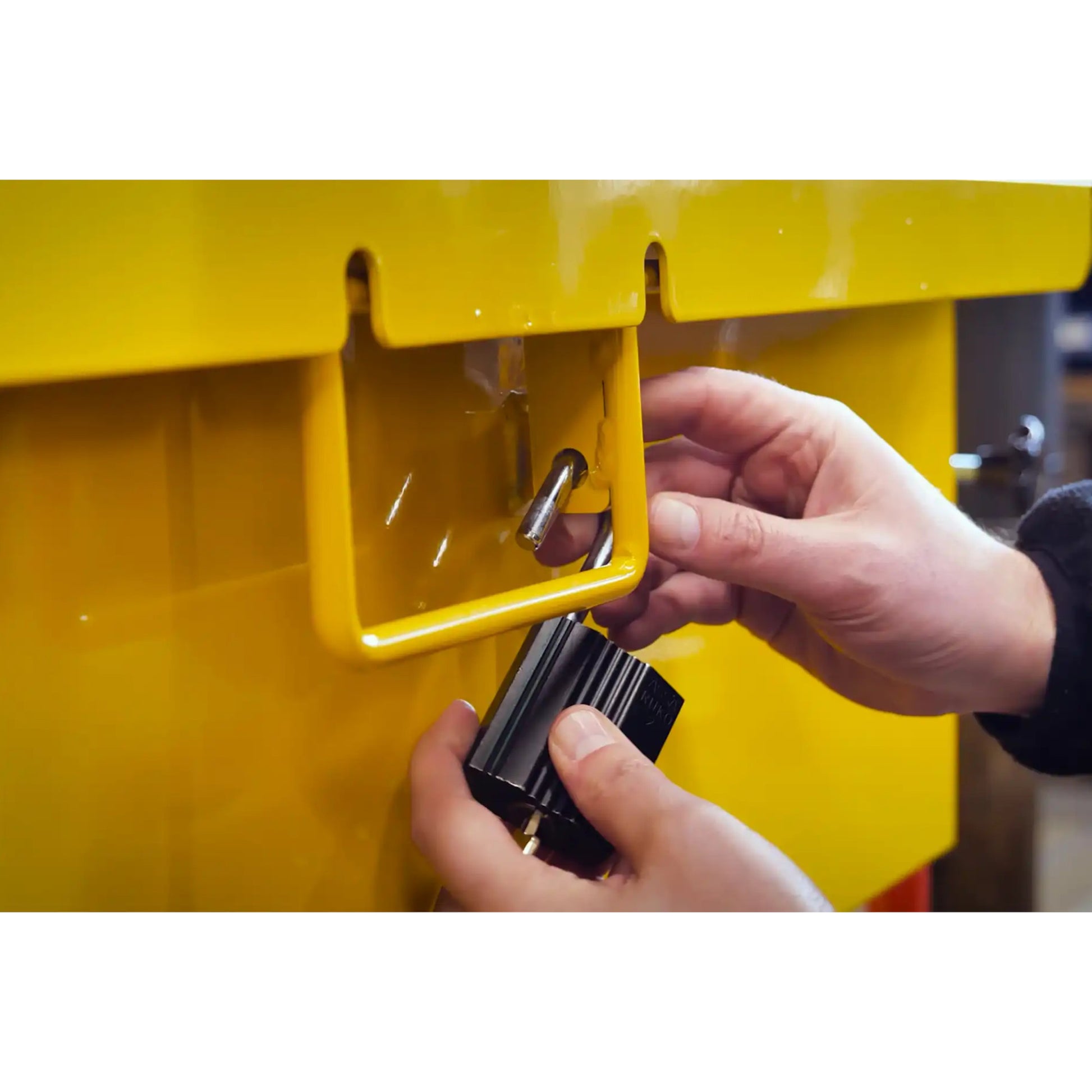 Deze gereedschapswagen is voorzien van geïntegreerde zijsteunen die zorgen voor een stabiele en vlakke werkpositie. In combinatie met de meegeleverde werkplank kunt u diverse gereedschappen en materialen stevig vastzetten en direct op locatie gebruiken. Het afsluitbare deksel beschermt tegen diefstal, stof en weersinvloeden.